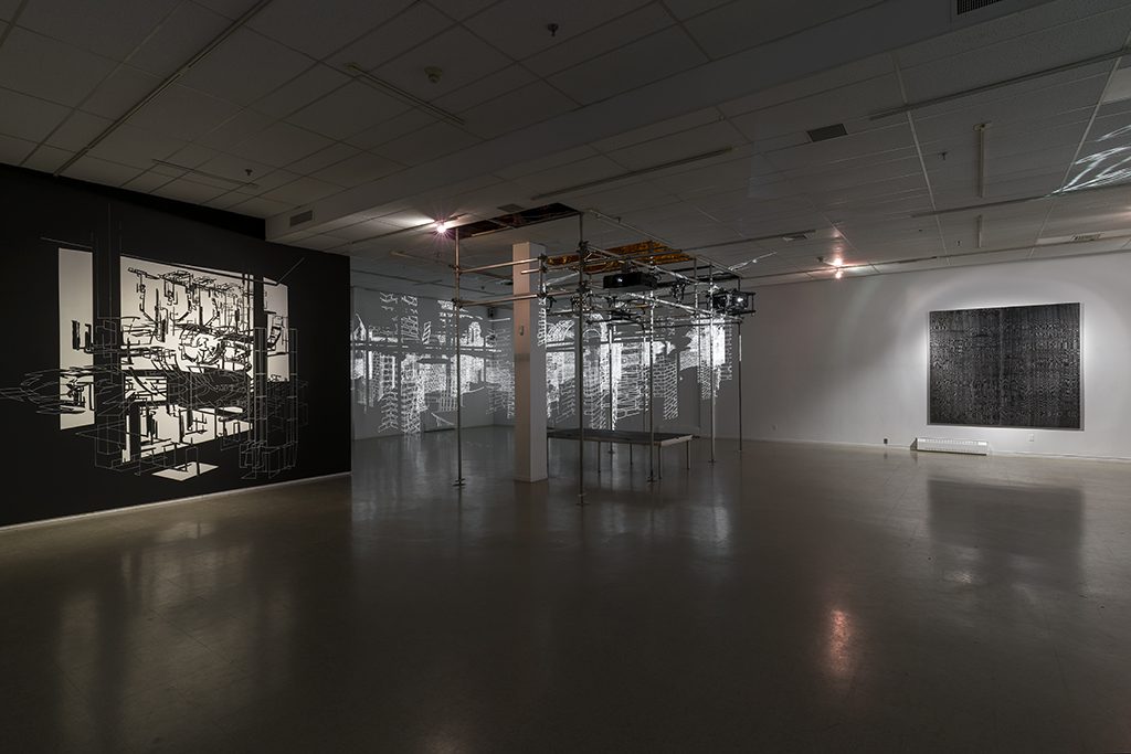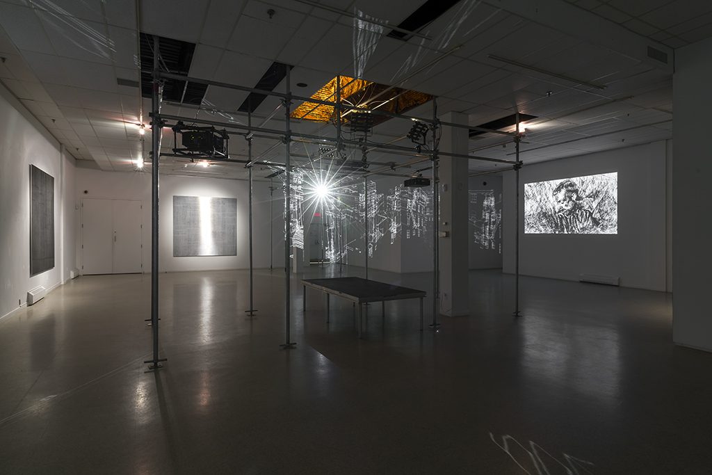 Alors que le dessin se manifeste dans sa forme traditionnelle par un arrêt dans le temps, l’exposition Cyclages propose une interrogation sur diverses stratégies telles que l’installation in situ, la boucle, l’optique et la mise en mouvement de l’image par le déplacement du regardeur. Comment la durée transforme-t-elle la temporalité du dessin? À force de tourner, retourner et détourner le dessin, de le répéter et l’animer, il fluctue dans des espaces expansibles qui réorientent sa nature, ses lignes, ses formes, ses pleins et ses vides.